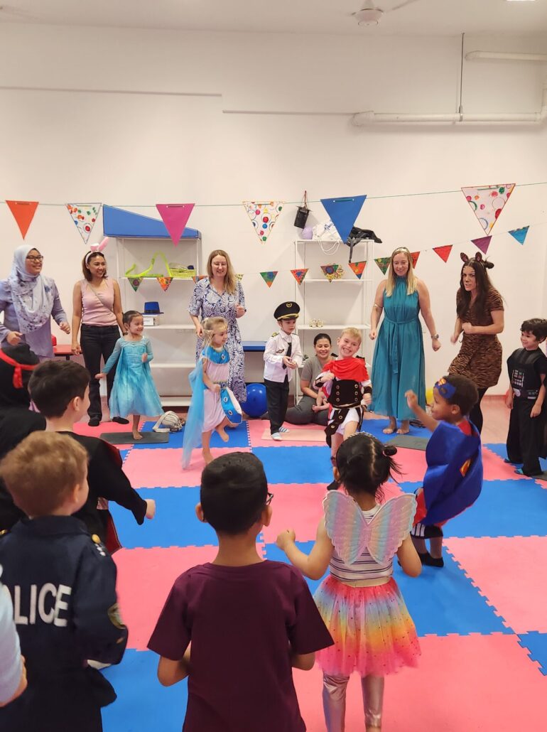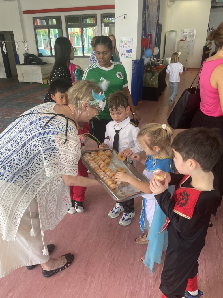 Doch die Mühe wurde belohnt: In der Kantine warteten leckere Krapfen auf uns. Mit Puderzucker im Gesicht und einem Lächeln auf den Lippen stärkten wir uns für die nächste Runde Spaß. Zurück im Kindergarten hieß es noch lange nicht Ende! Im Gruppen- und im Dojo sowie Vorschulraum wurde weitergespielt, gelacht und getanzt. Und auch am Nachmittag war noch nicht Schluss: Auf dem Spielplatz flogen Ballons durch die Luft, es wurde gerannt, gekichert und gefeiert, bis auch der letzte Superheld und die letzte Fee müde nach Hause schwebten. Was für ein Tag voller Farben, Fantasie und Freundschaft! Fasching 2026 wird uns noch lange in Erinnerung bleiben.